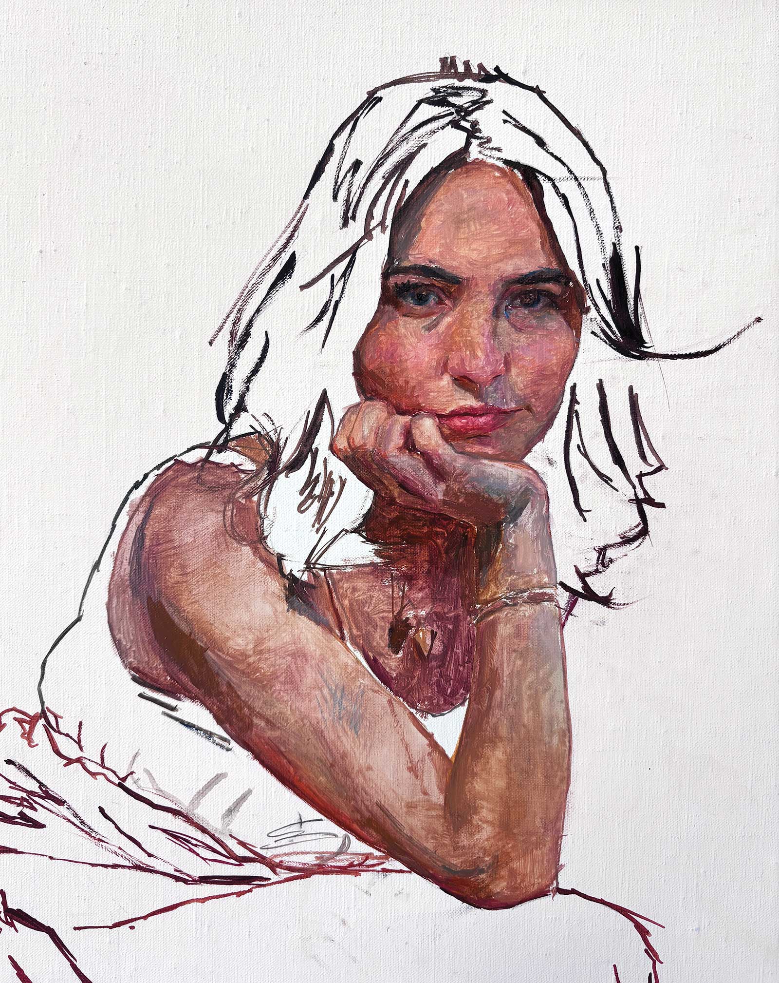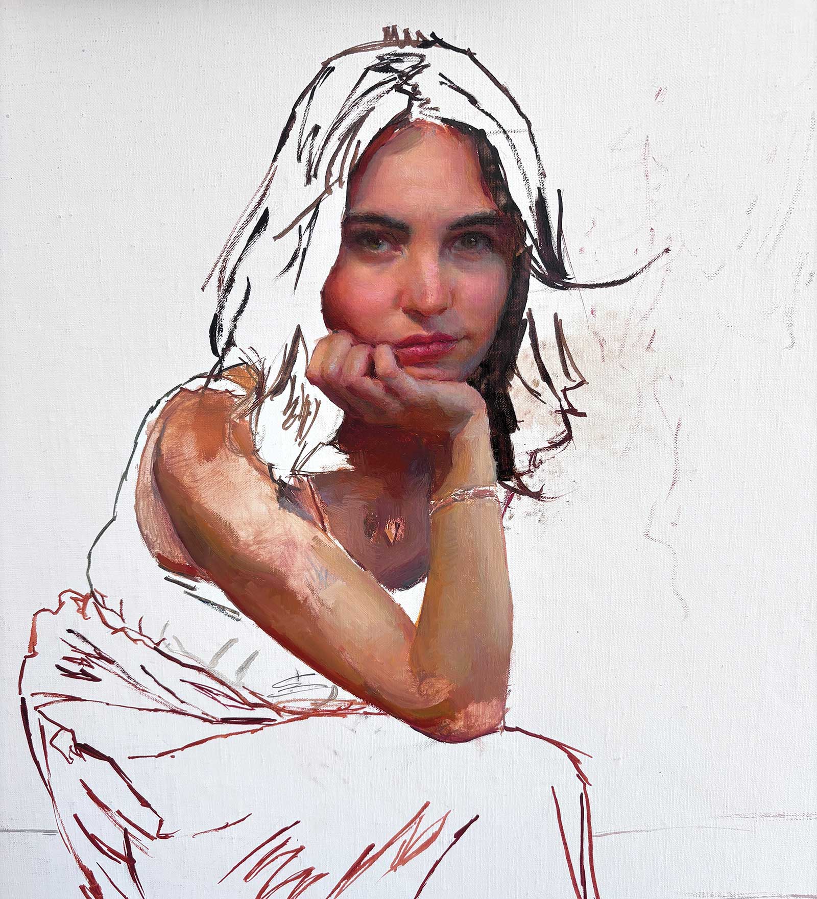 If I am working from poor photograph references or combining multiple references, I often complete a preliminary drawing in graphite to explore the subtle anatomy of my subject, which is then transferred to the canvas. In this case, the photographic reference, taken under stable studio conditions with a posed model, is clear enough to begin directly on the canvas. The paint is thinned with Winsor & Newton distilled turpentine, which dries faster and creates a stronger thinned paint film than odorless thinners. After a few preliminary outlines are drawn in, I work slowly from one section to the next, starting at the forehead and working my way down. I don’t use white to lighten the paint. I instead treat it like a watercolor and allow the white of the canvas to create lighter values. I stick to just the skin, no fabric or background. Because I am working from a reference that allows me to have the same light on my canvas as the reference, and thereby compare/replicate colors exactly, I do not need to tone the canvas or block in other areas to establish a relationship.