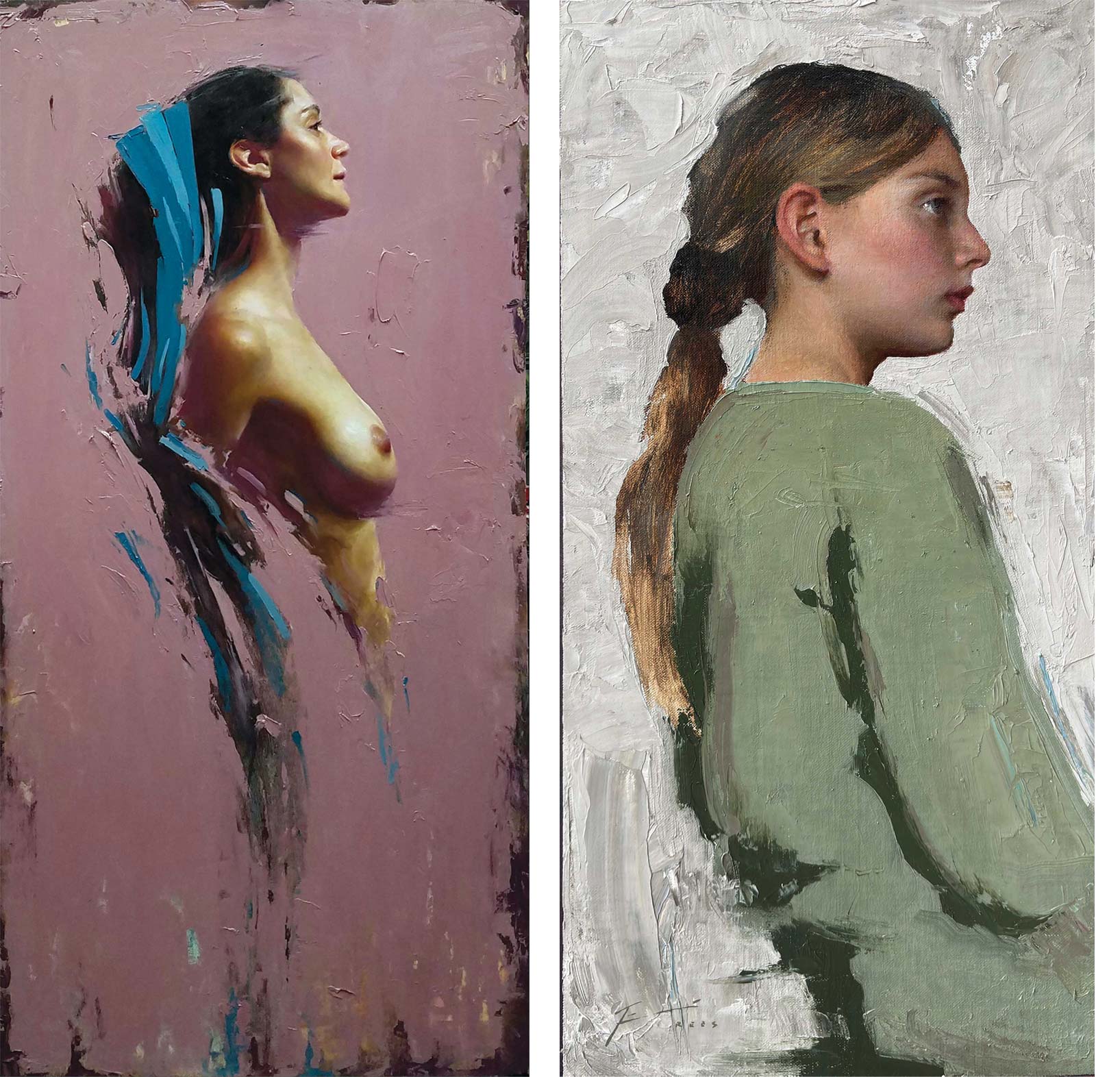 Left: Emergence, oil, 40 x 22” (101 x 55 cm) Right: Stoic Amidst Chaos, oil, 20 x 10” (50 x 25 cm)