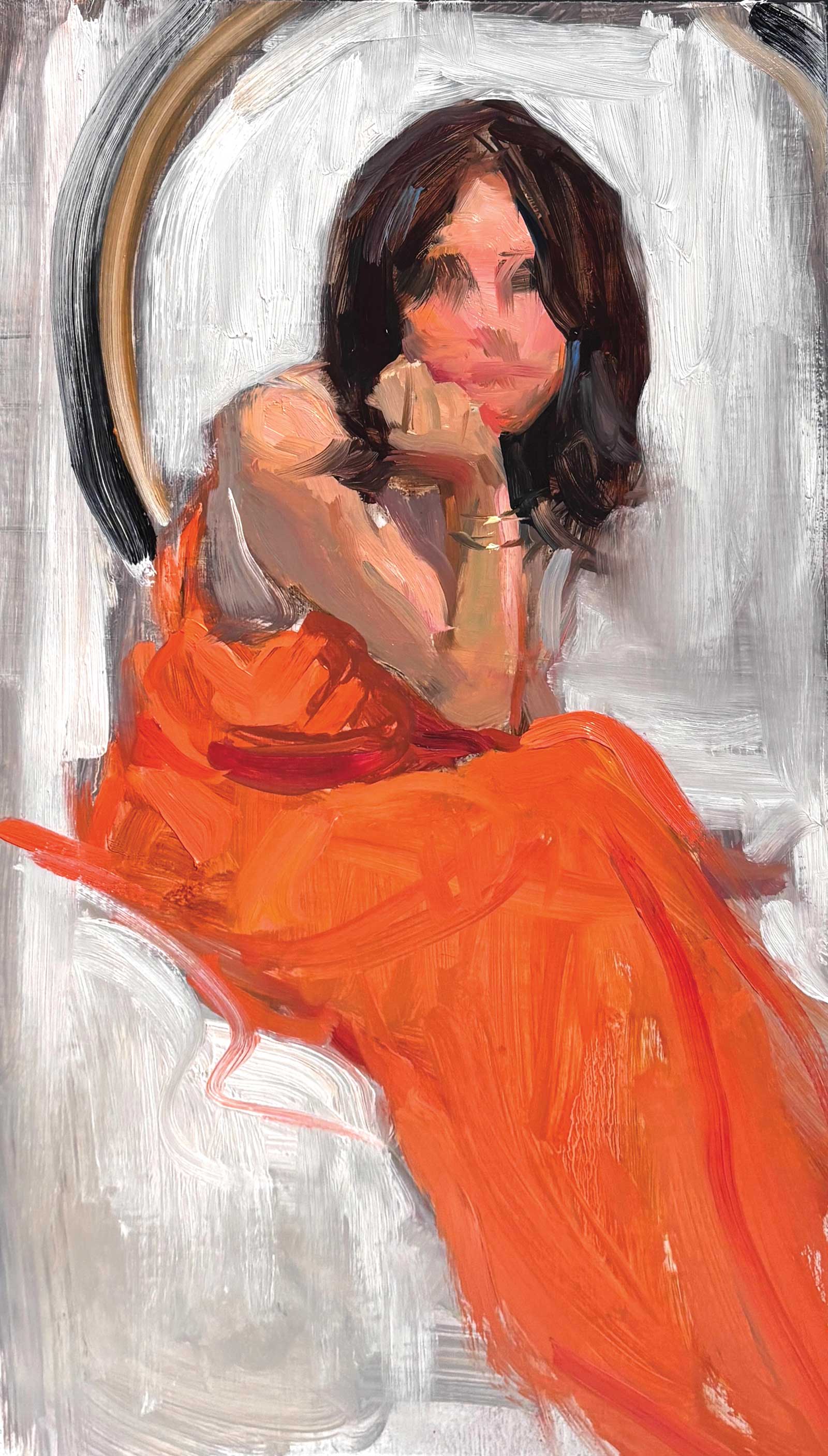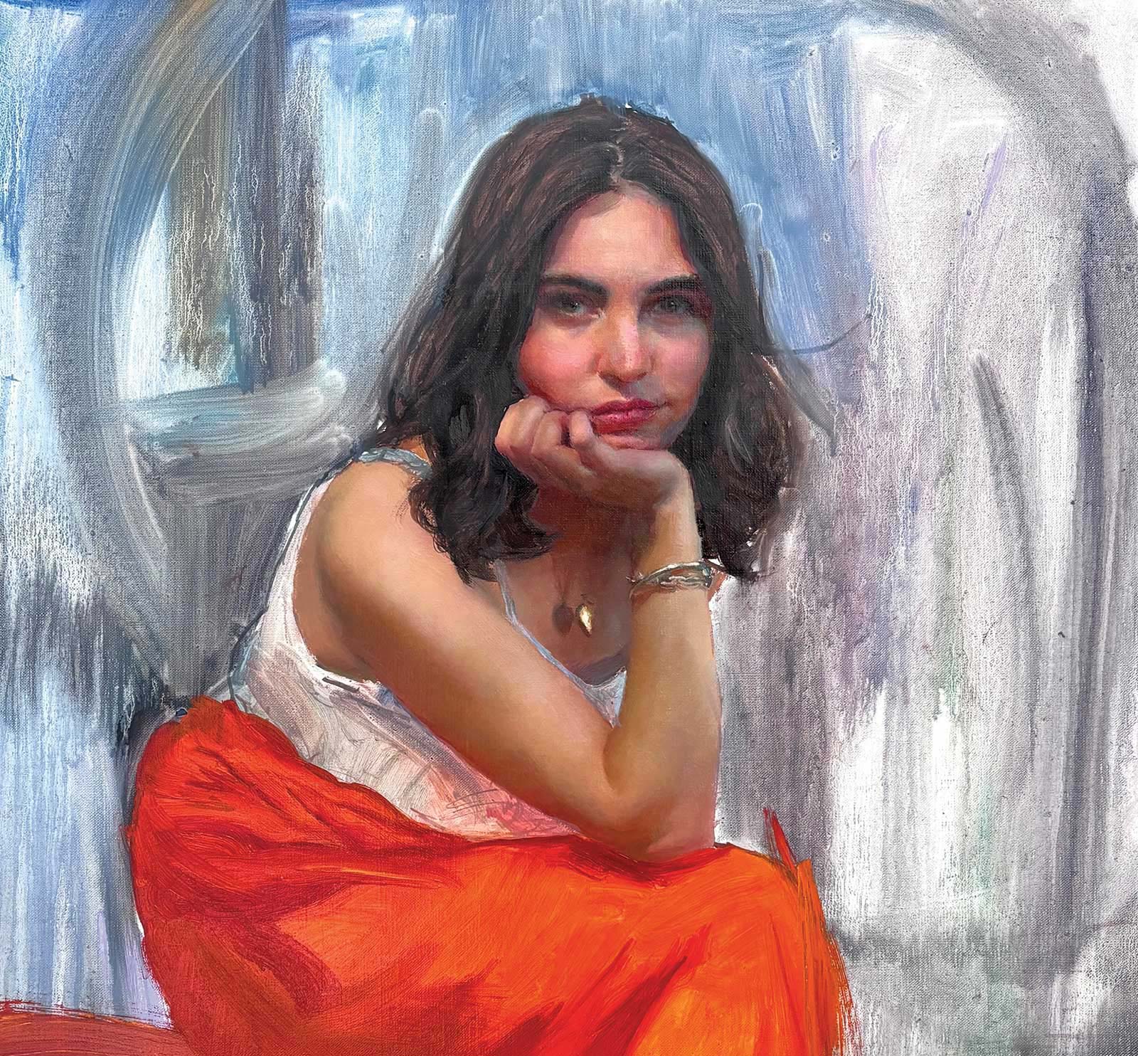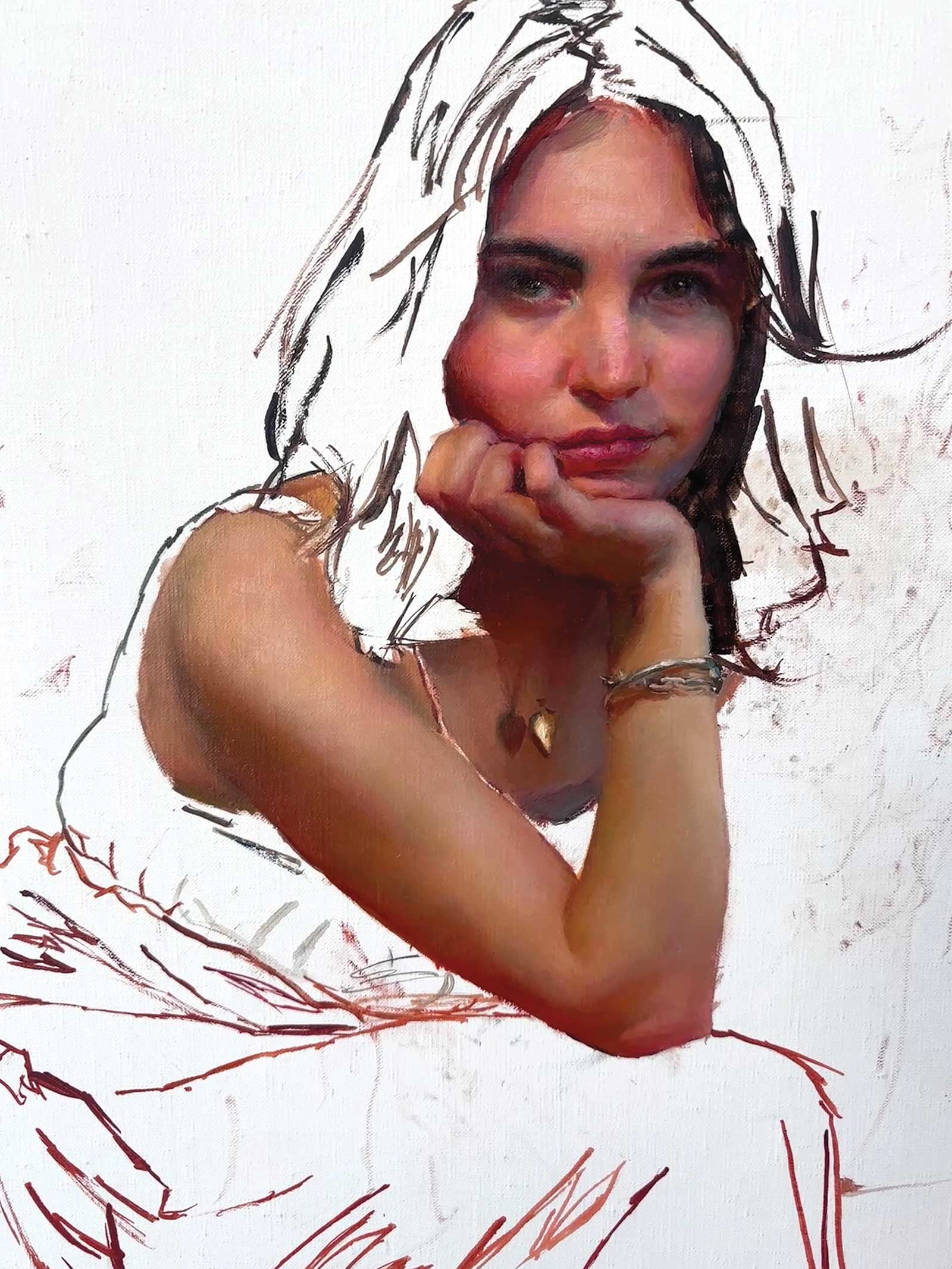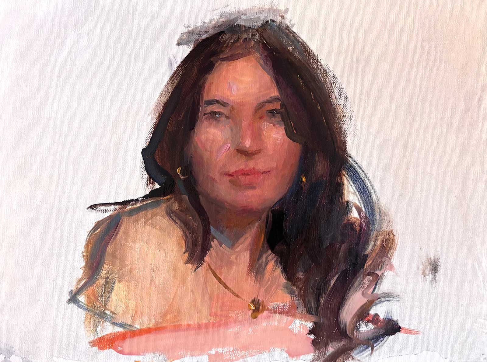 Because the final painting will be from a photograph, I paint a color sketch of the model’s portrait, which takes another hour or so. While the drawing is important to capture small mannerisms of the model I might want to include in the final work, such as her slight smile, the color is of paramount importance. I will adjust the photo reference to match the color from my color sketch to ensure it is vibrant and lifelike. Once the studies are complete, I photograph my model and adjust the reference as needed.