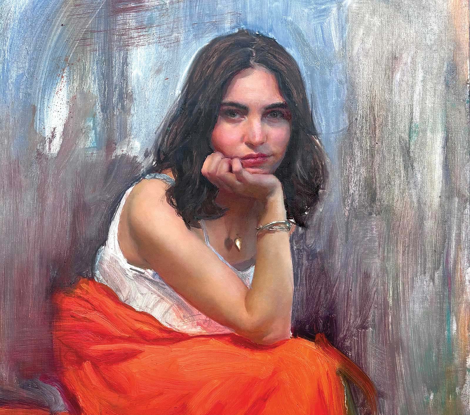 I have always been drawn to the human figure. It can be portrayed in endless ways to produce endless effects, from tightly realistic to wildly abstract. As I have never been one to settle, my artistic pursuits meander and wind through different styles to satisfy my curiosity while searching to create something alluringly beautiful. This work, June’s Captivation, is an example of the departure from my more grounded outdoor figurative work toward one of tantalizing abstraction and wild paint handling. Through planning, building, scraping and changing, I have a chance to respond to the painting as it is being born, coaxing it toward its final state. I always want the figures to say something—to offer insight into themselves or humanity. With this type of work, though, I desire more. When I have captured the charm and intriguing depth of my model, and immersed her in a visual poetry that feels balanced yet energetic, imploring me to continue searching my eyes over the field of varied paint to absorb every detail, I know it is done.