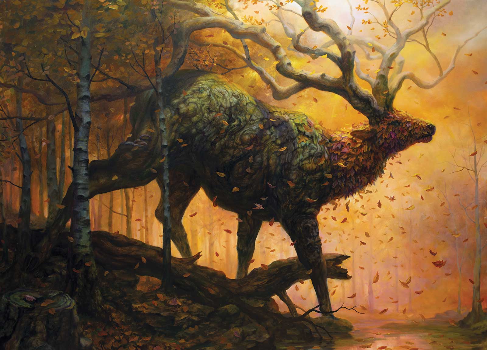 Some paintings focus on the four seasons, while others on the four classic elements of fire, earth, water and air. All of them feature colossal beasts that feel almost like heralds of some sort of apocalyptic reckoning. In Aspect of Autumn, a gargantuan stag emerges from the woods, its body made of gnarled bark and leaves, and its antlers a labyrinth of twisting branches that recede into the trees. “It’s kind of meta, but I planned and executed all of these paintings in the seasons they were about. This one, it was late autumn,” Wittfooth says. “I’ve often had this affinity toward this idea of animals that, in various ways, we often think of as prey animals or trophy animals. With this painting, I wanted to go toward that animal, an elk, a stag…The falling leaves had so much movement to them. It’s not random, there’s this flow and rhythm if we pay attention to it.”
