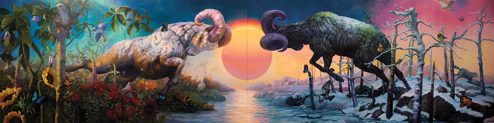 Speaking of Duel, it’s an incredible piece, and the one that kicked off the entire project. Depicting two giant rams charging at each other, the painting started as an album cover commission for Canadian metal band Protest the Hero. “When we started to collaborate on the idea for it, it started to sync up really well with what I’d already been thinking about—these dual states,” Wittfooth reflects. “There’s a winter side and a summer side. Opposites. Reverse parallels. As I was painting, in a way, it sewed the seeds for other paintings too.”
