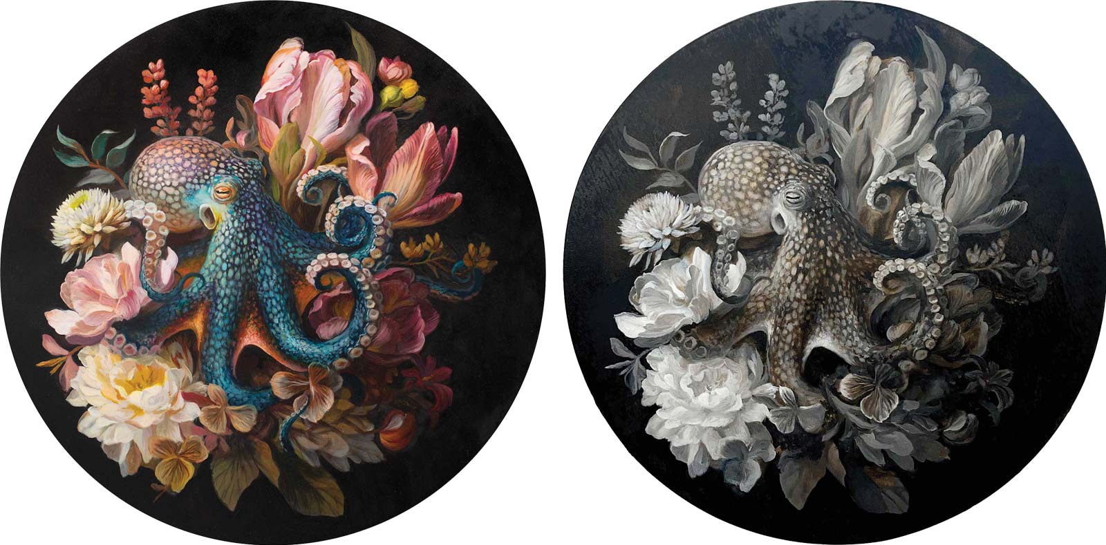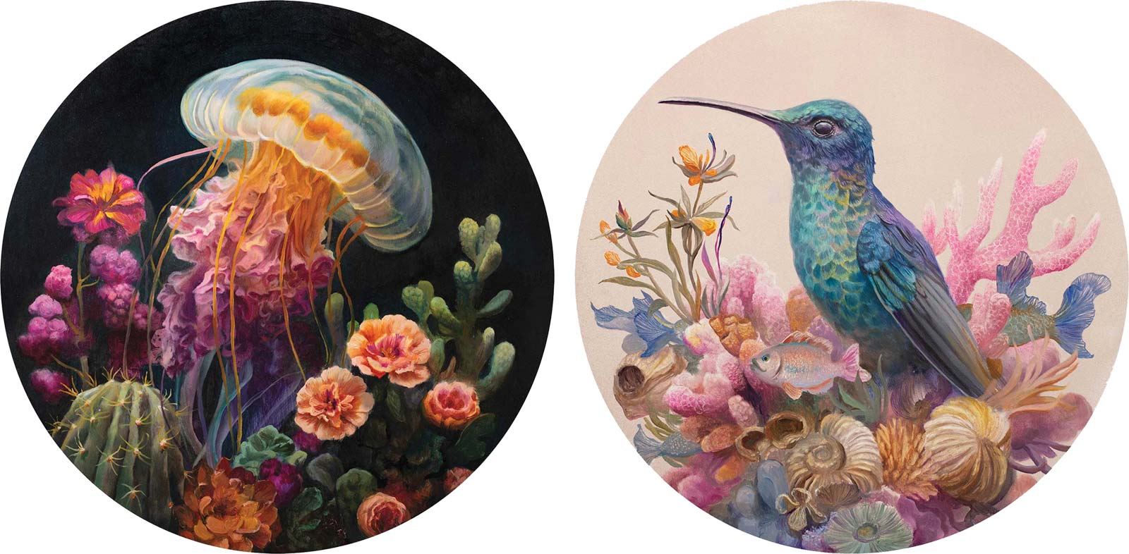 “There’s this pull for me toward the rhythmic, cyclical beauty all around. I wanted to sort of turn the scope toward the celebration of that. With all the paintings there’s this ethos I’m following, which is to look for rhythmic forms that echo each other, even if they’re not [strictly] related…Forms that harmonize well,” he says. Several of Wittfooth’s smaller paintings in the show reflect these paradoxical parallels: an octopus resting among terrestrial flowers in Parallelism 1, a hummingbird among fish and coral in Parallelism 2, and a jellyfish among cacti and succulents in Parallelism 5. Further punctuating the idea of cyclicism, each of Wittfooth’s smaller-scale pieces in the show were rendered in a circular composition.