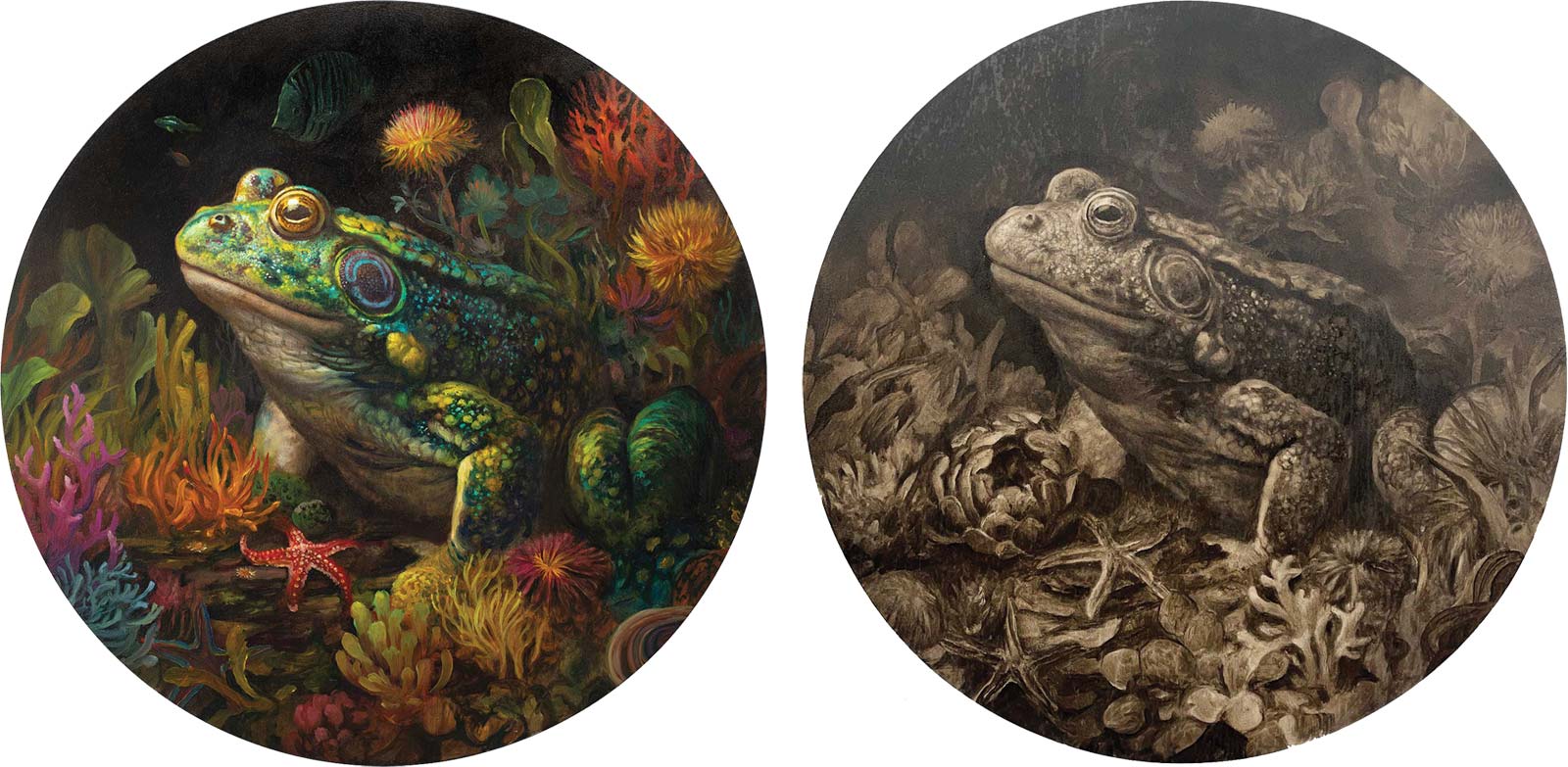 The colors in Wittfooth’s paintings are brilliant, saturated, and as full of diversity as the natural world. The next step in his technical process almost always involves a monochromatic underpainting, similar to a grisaille. “For example, with the four element paintings, they all had a burnt sienna wash. And while the paint is still wet, I work into it with just one tone. Wherever the values are lighter than the tone I laid down, I use very high-tech tools like rags to lift the value. And for the mid and darker tones, I’ll use the same color [burnt sienna] to keep it all monochromatic. Starting a painting with a white canvas, I’d be missing out on a lot of the organic marks that I’m creating [by lifting and working with the underpainting.]...A few days later, I can come back and start to add other colors.”