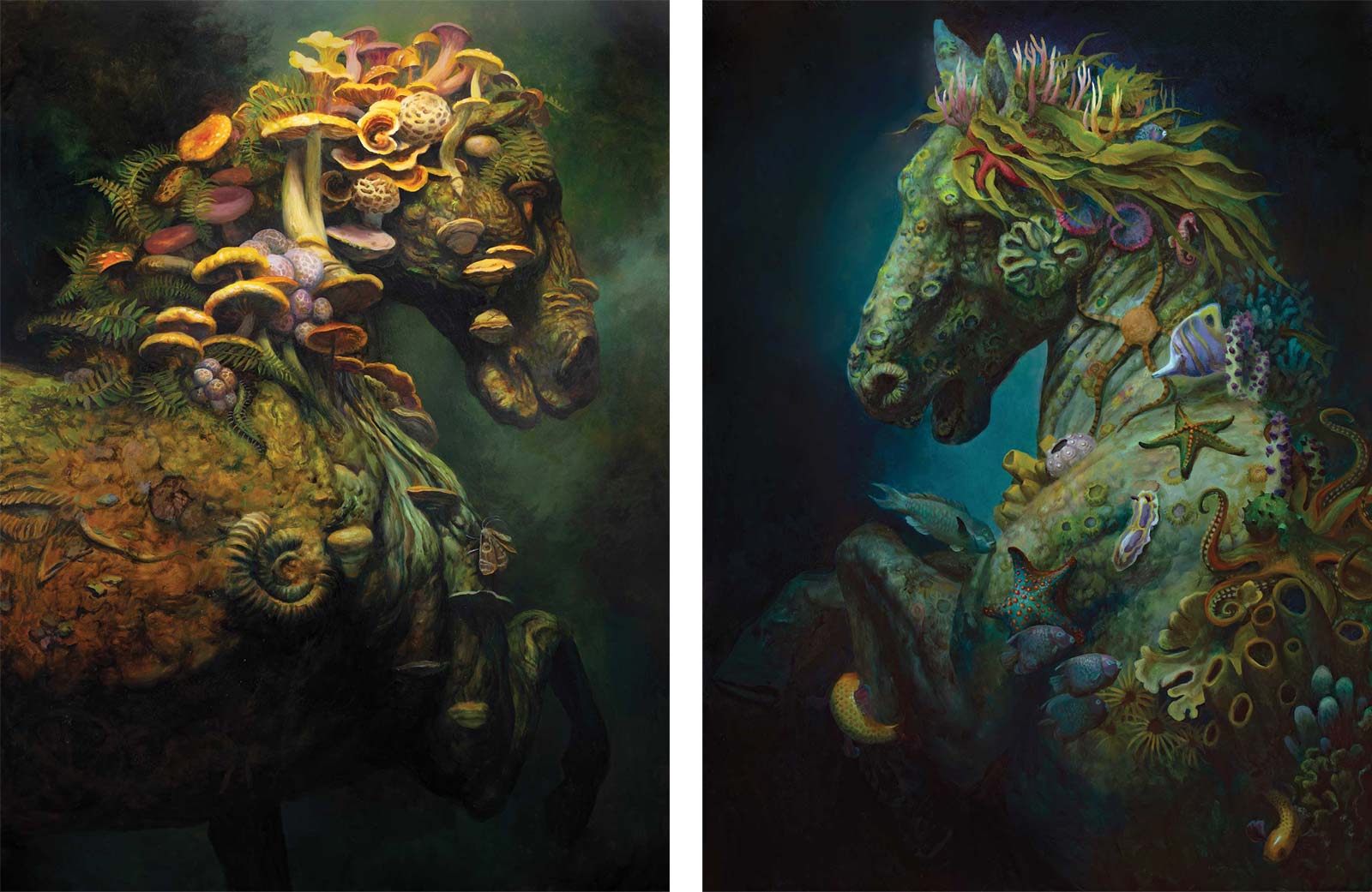 In Aspect of Winter, a wolf made of ice and snow crouches on top of a massive iceberg. The surrounding trees are dwarfed by the wolf, giving us that sense of enormous scale. Both Aspect of Earth and Aspect of Water are portraits of horses that are metamorphosing into their surroundings. In the painting representing Earth, the horse is made up of mushrooms, ferns and moss; and in the one representing water, the horse looks like part of a coral reef.