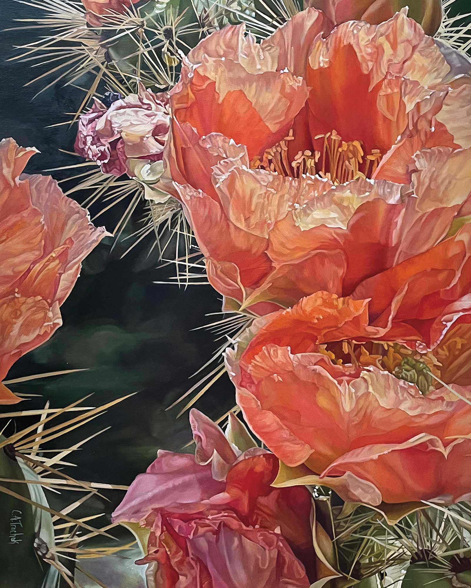The inspiration for all of my work is color and light and how they embrace the form, whatever that form may be. On this specific piece, my inspiration was the challenge to communicate the beauty and impact of these glowing flowers blooming softly through the sharp spines.