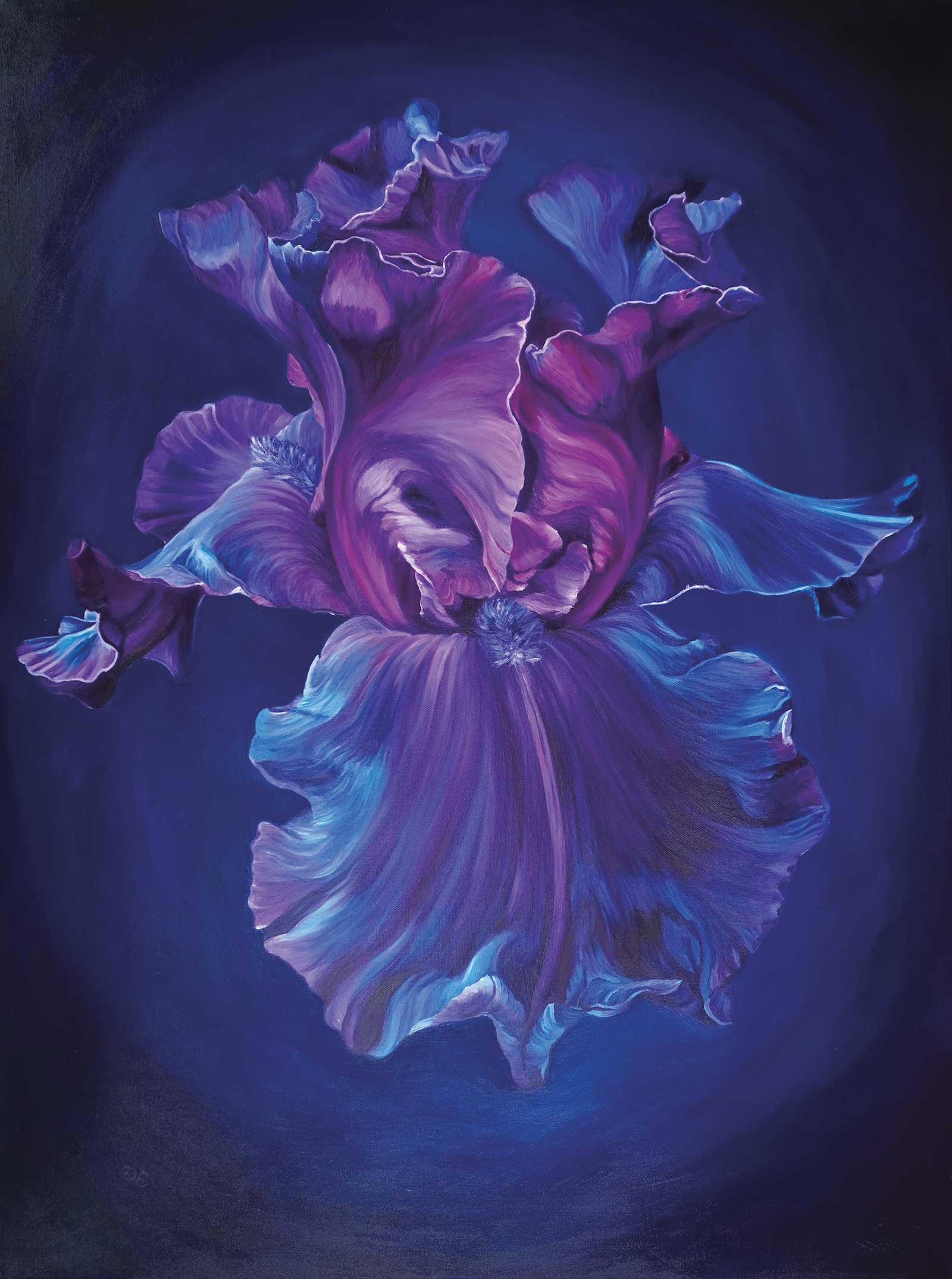 The iris has become the central motif of my work, a portal through which emotion, intuition and transformation are revealed. I approach each composition intuitively, seeking an image that resonates with my inner state at that precise moment. I later realized that my choice of the iris was never accidental: its mythological name, Iris, refers to the messenger between gods and humans, a bridge between visible and invisible worlds. In Dioxazine Divine, the flower dissolves into abstraction, inviting self-reflection and exploration of one’s own inner universe. I trust intuition to guide every decision—light, pigment and contrast—allowing the painting to unfold organically rather than be predetermined.