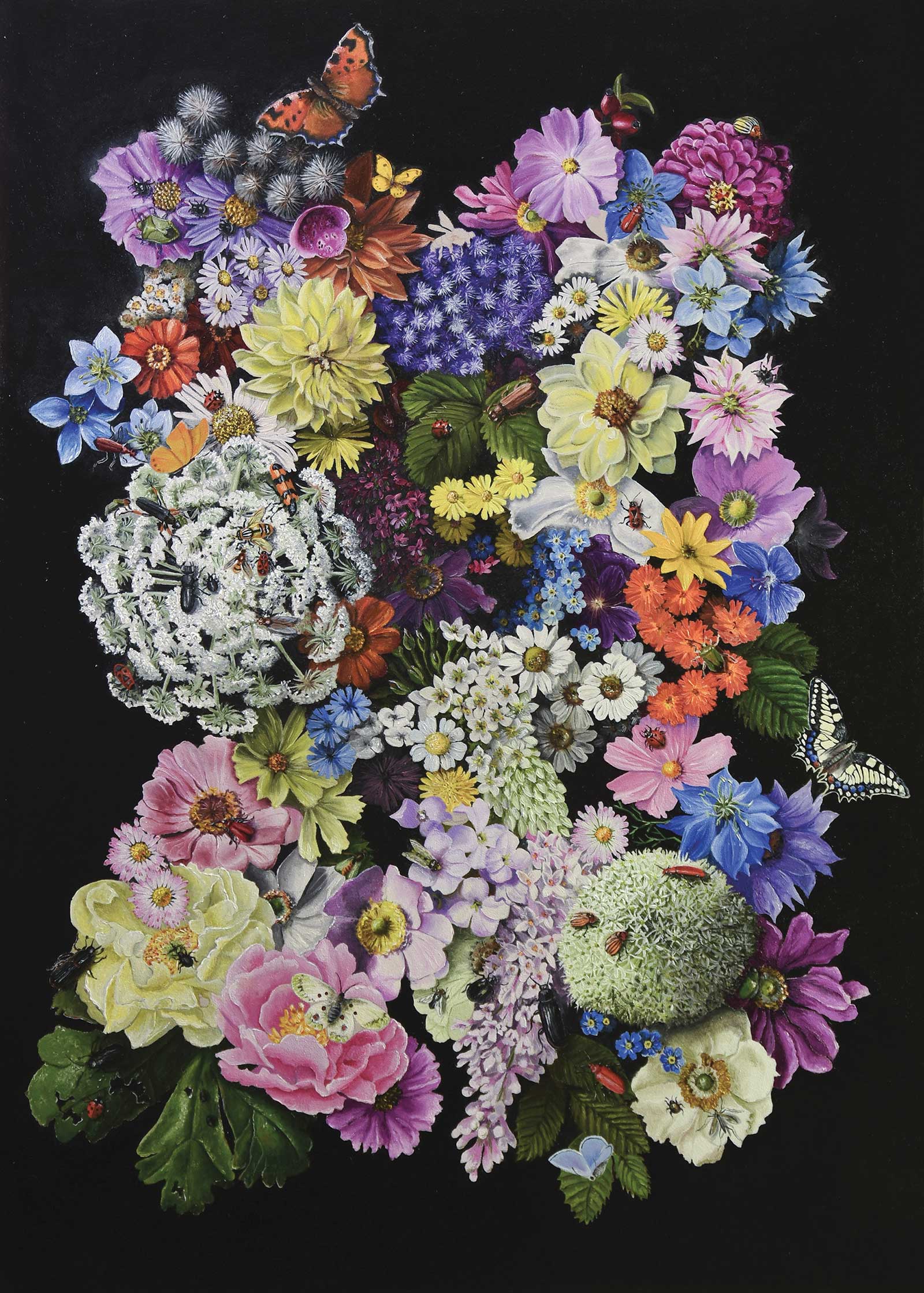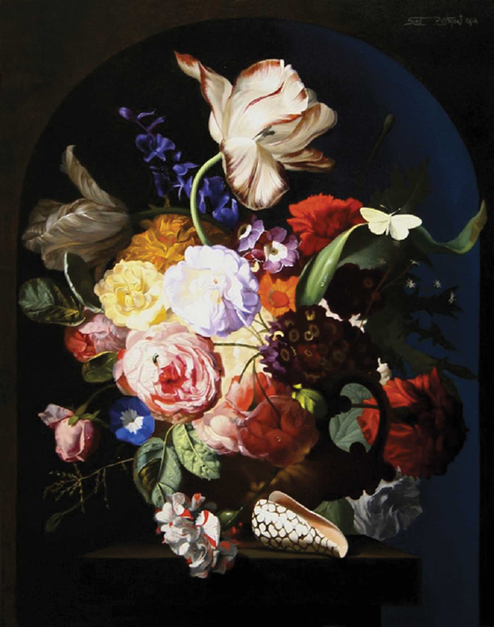 As this was a commission, my work was already cut out for me. As most of my florals are very Dutch in their style, my client wanted that same approach here in this piece. My true inspirations for my florals are the Dutch Masters such as Jan van Huysum, Rachel Ruysch and Jan Davidsz. de Heem, and that’s certainly no different here. Following their paths with niches, dark contrasting backdrops and interesting curved compositions highlighting some flowers, while intricately integrating and blending others in the middle and back to carry out the dramatic 3D effect of depth help to bring this piece to life.