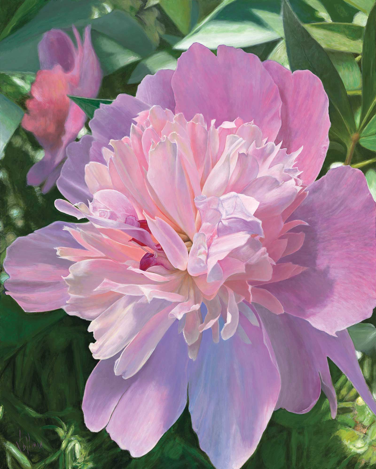 I have always found inspiration close to home. This painting became part of a series of large-scale florals created after I was mindlessly staring at a pot of colorful petunias on my patio in the hot sun. As I zoomed in, I was thrilled to discover the myriads of amazing translucent color schemes. In that instant, I knew I had an unlimited supply of subject matter for a new series. Pink Peony became part of this new series: a close-up view of a 3” peony rendered in acrylic on a 4-by 5-foot canvas.