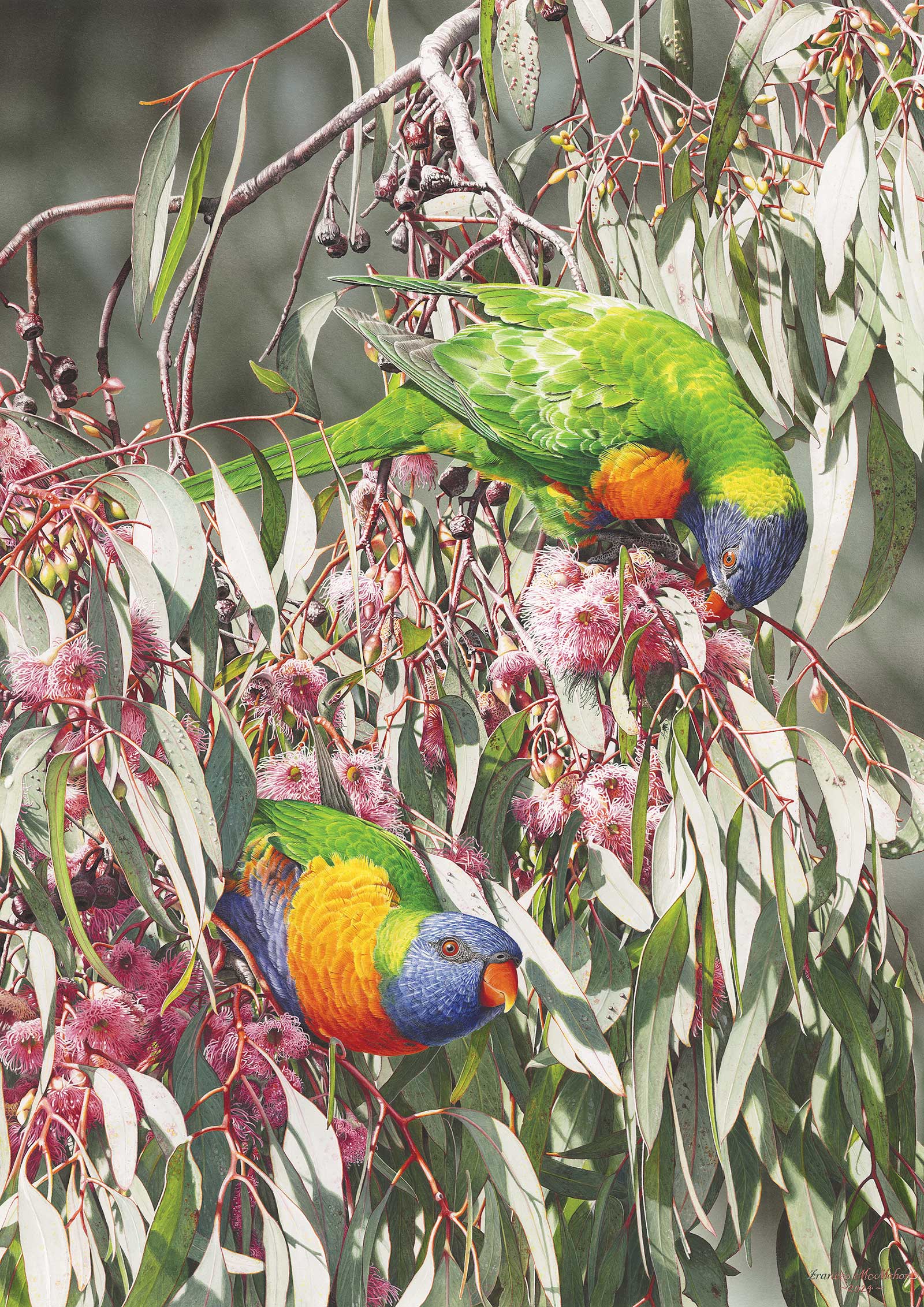 My client had very clear ideas about the size, content and format. They wished for a painting of two rainbow lorikeets feeding on a flowering gum crammed with leaves and gum nuts. The painting was sized to fit a particular wall in their home and was best suited in a long portrait format.