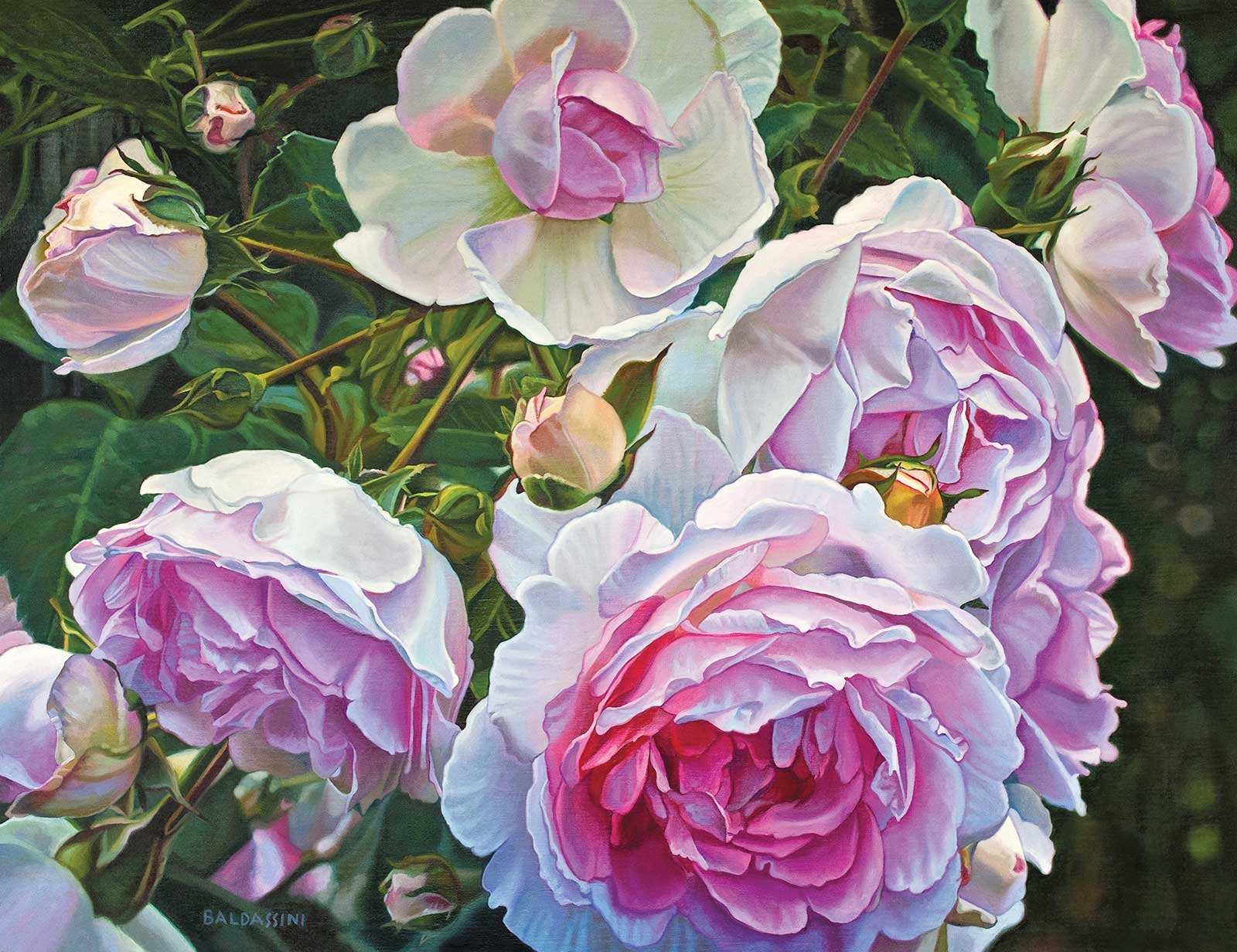 These days, Connecticut-based artist Paul Baldassini finds himself most captivated by floral subjects, especially peonies and roses in the deep, golden light of late morning. While the artist also paints landscapes, his crisp, vivid florals—which he has been painting for more than a decade—are the true showstoppers. His particular style of realism, he says, is influenced by the 16th-century Flemish master painters, notably Peter Paul Rubens and his contemporaries.