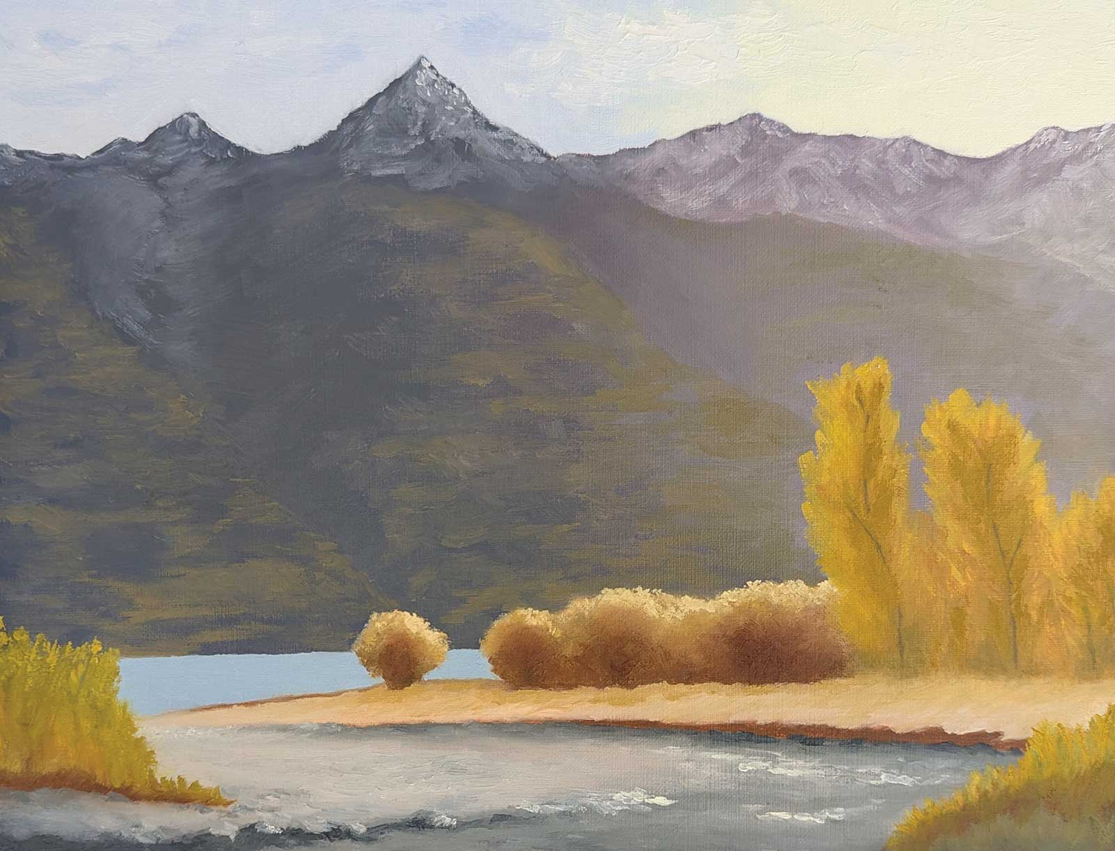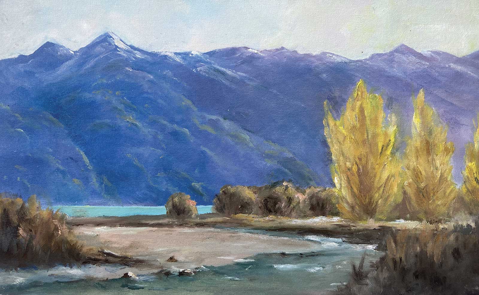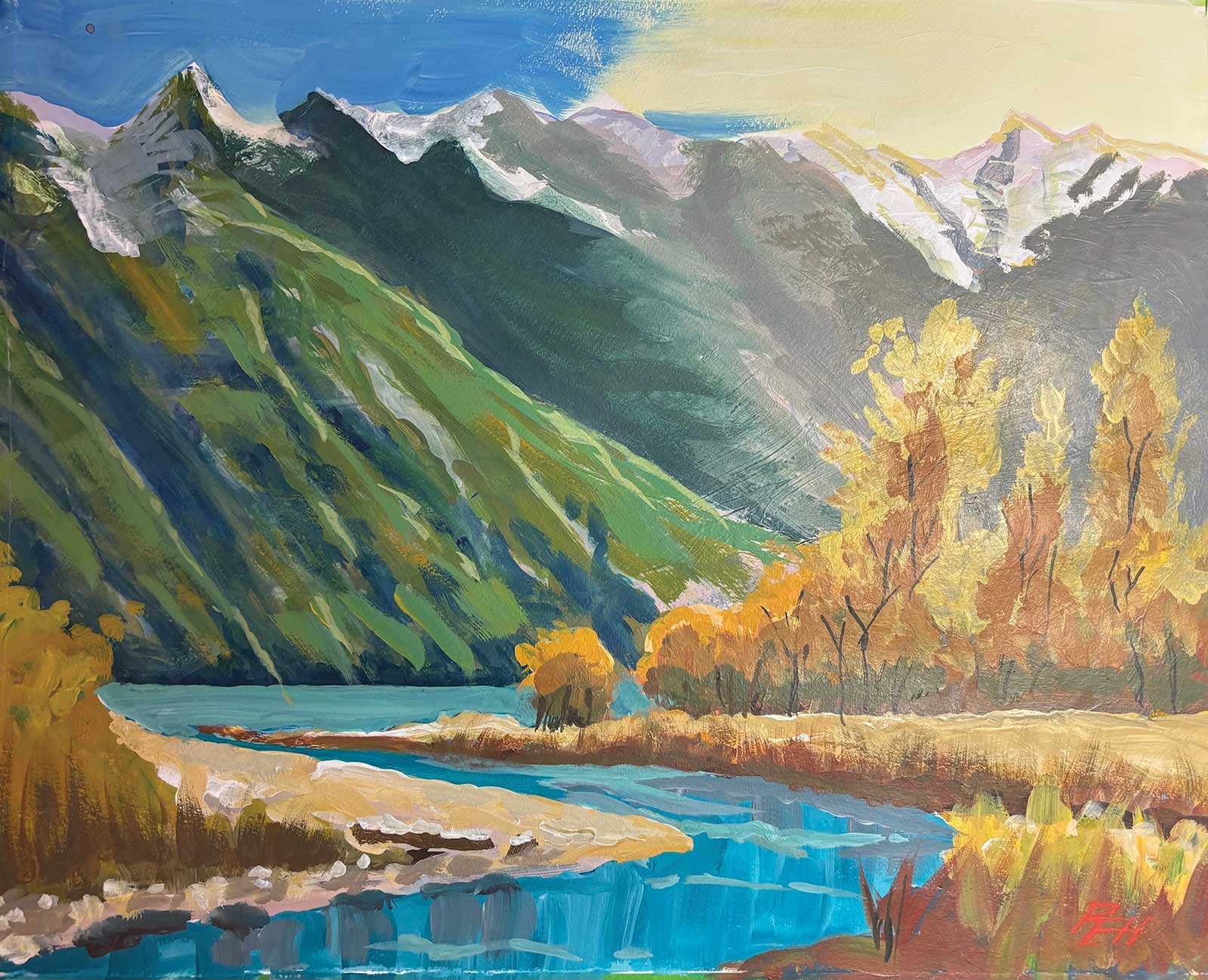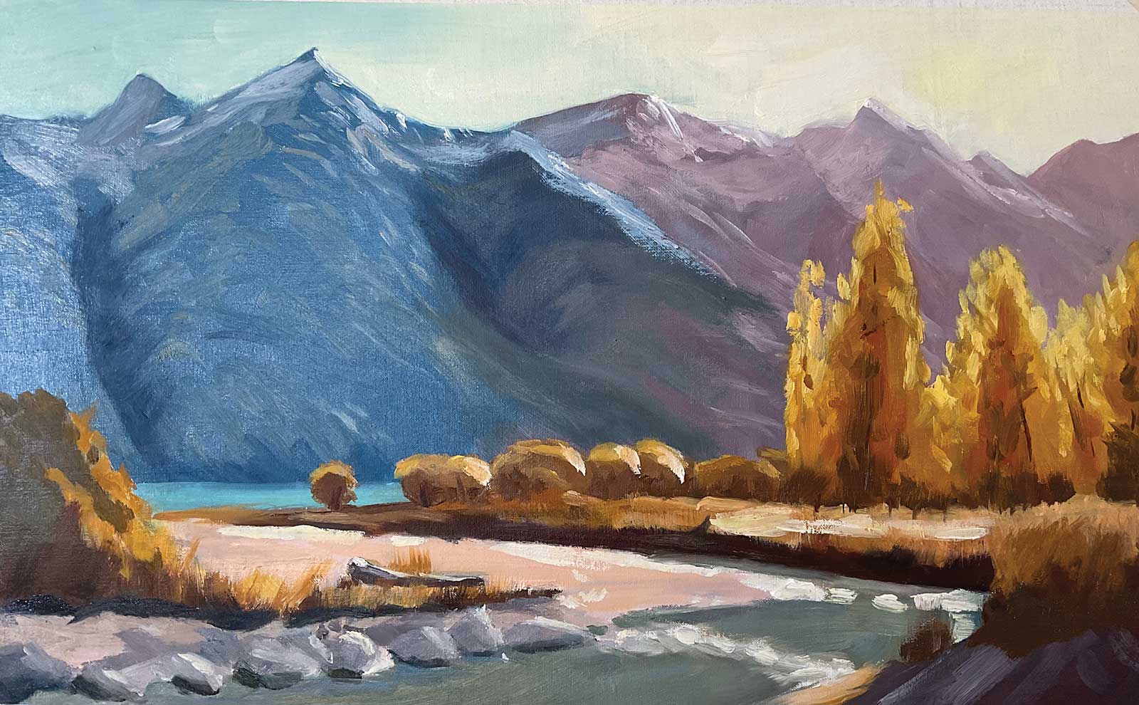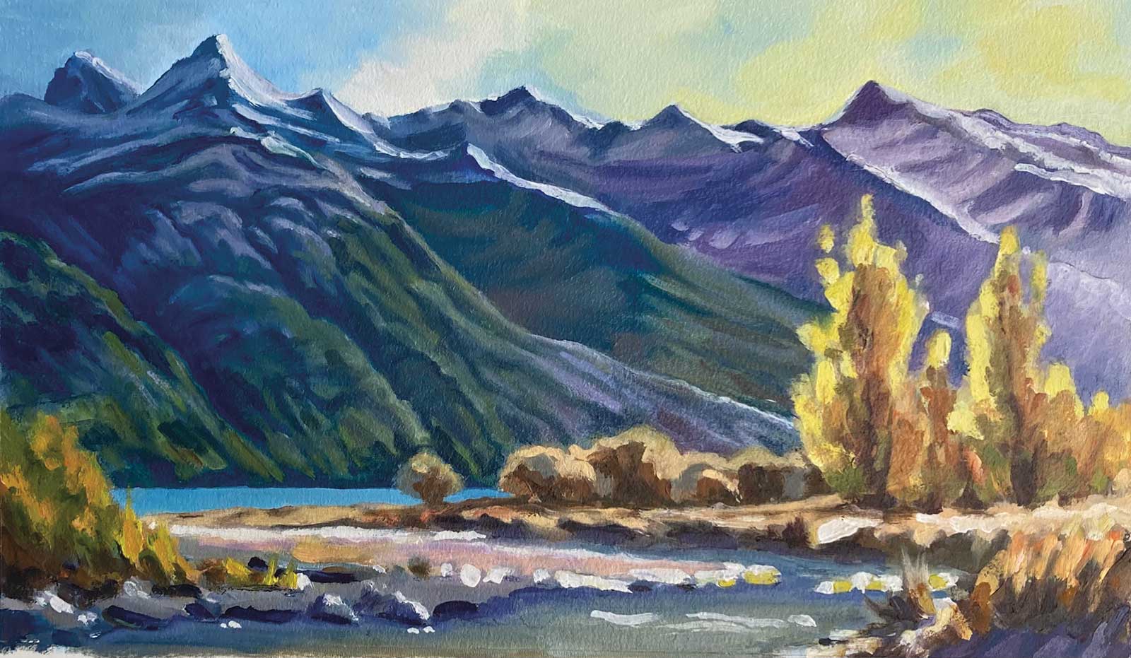 Nice one, Fay! Those poplars are really glowing with light, a nice color contrast against the slightly more purple mountains. Note that if you’d used slightly lighter, warmer grays in the darkest darks of the smaller trees in the midground, they too would have more of a warmer glow about them. By using the same darkest dark there as in the foreground darks, you’ve shortened that space between the foreground and the midground. Nice organic brushwork in those areas. Also nice building of form in the mountains, particularly in the snow. Some of those darker greens are darker than the blue gray base color, and that needs to be avoided as that blue gray should be the darkest value in the mountains.