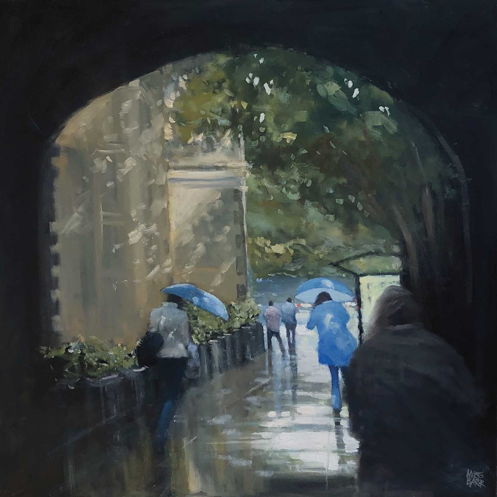 Painting street scenes is nothing without including what is going on in them. So, people who are going about their everyday business can bring a painting to life like nothing else can. The lady in blue on the left is a primary focus that leads into the rest of the scene, while the dark figure on the right foreground balances things out. I love the idea of the painting bursting out of the darkness of the arched portico; it’s a natural progression for the eye to follow. And there is nothing like rain to add some drama.