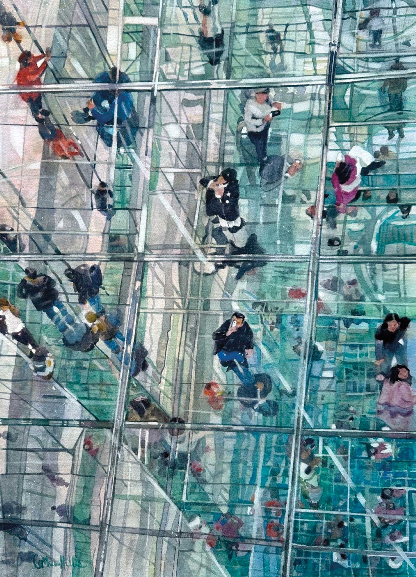 Her Grand Prize winning piece, Freefalling, features people looking up through glass panes taking pictures with their cell phones.
