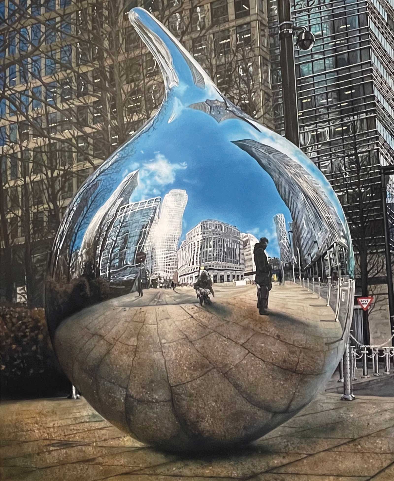 Photorealism artists such as Estes, Sparnaay, Goings and Averbach are my idols. Capturing what are often considered mundane everyday objects or city scenes into lifelike works of art blows me away. The Tear Drop, a sculpture located in East London, depicts the ever-changing evolution of the business district. With glass and metal in abundance, the reflections on Tear Drop preserve a split second in time, serving as a memory of the many years I spent in that landscape. It’s pleasing to see viewers recognize that there is more to see than just the object in front of them.