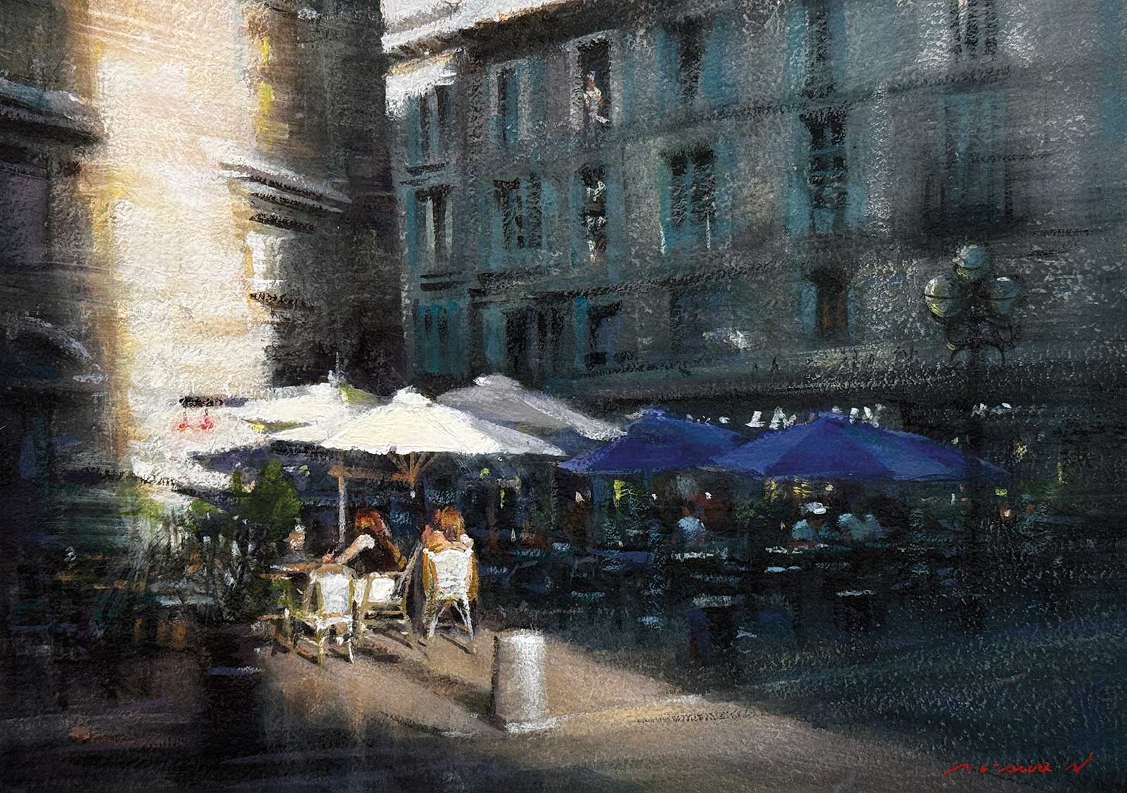 The inspiration for this piece is the dramatic light contrast defining a moment in an old Avignon street. I aimed to capture the timeless atmosphere where blazing sunlight meets deep shadow. The strong, almost abstract, golden glare on the left symbolizes warmth and immediacy. The café acts as a quiet refuge, where the human element grounds the scene in the simple comfort of everyday life.