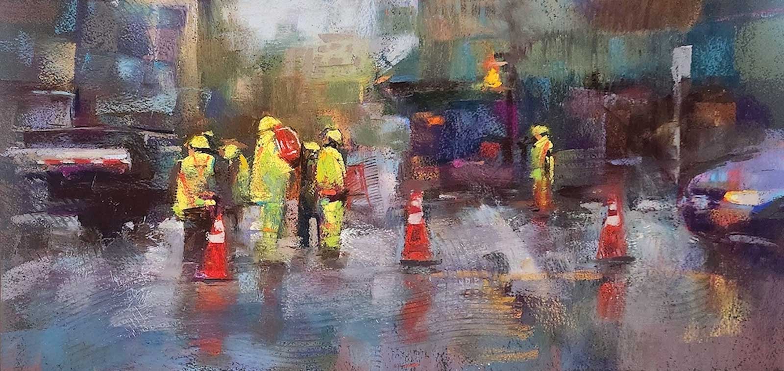 I love painting city scenes, specifically rainy or nighttime city scenes. One night, I was walking home in the rain and these workers caught my eye. I loved the yellowish, greenish work gear they had on, and the rain made the scene feel like more work in a sense. I love the atmosphere of people in the rain either walking in the streets with umbrellas or doing construction work.