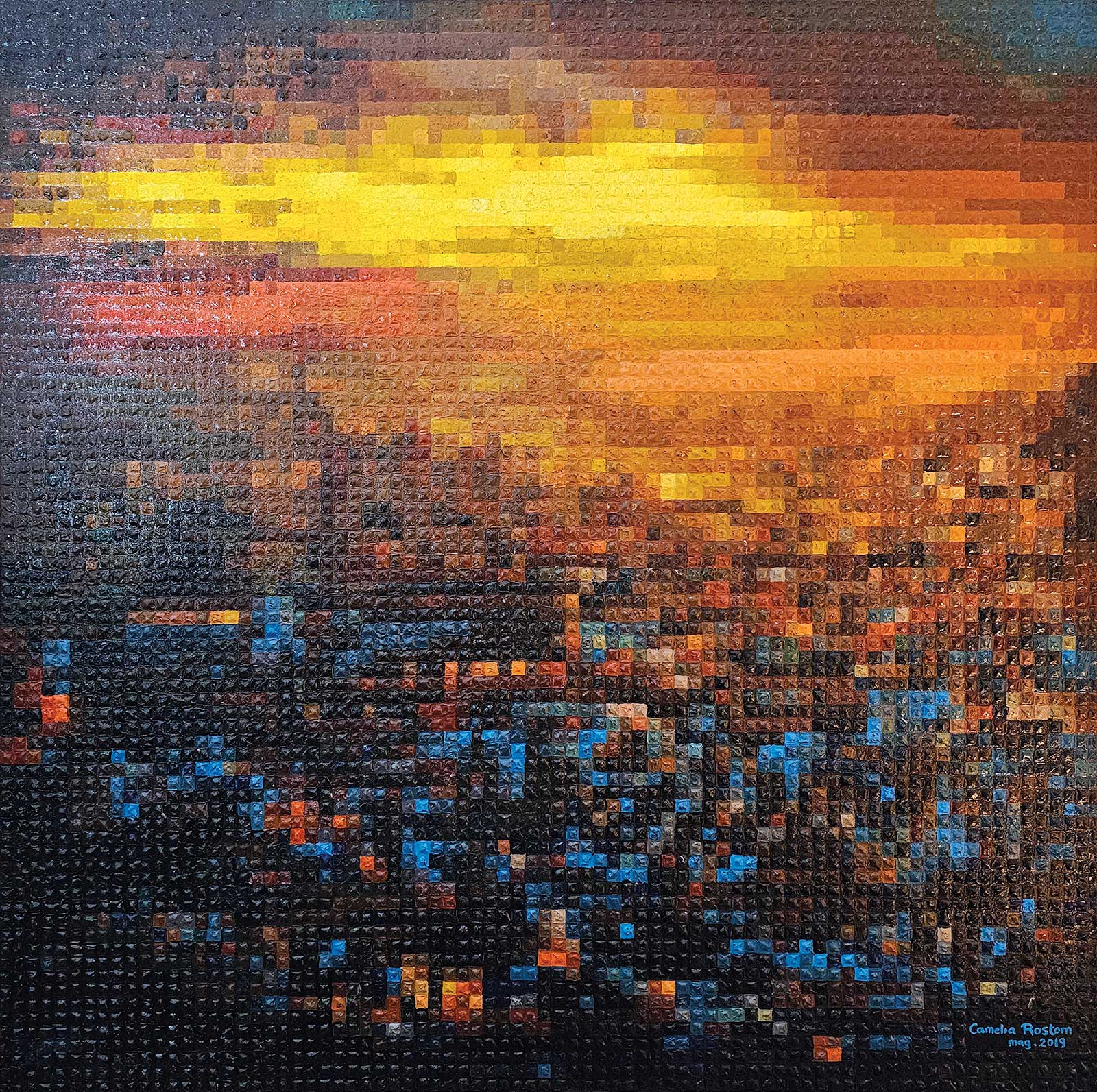 I was first inspired by the pixelated aesthetic that transforms an image into a mosaic of vibrant color blocks. The idea of creating a painting filled with countless small details immediately fascinated me. I began with a traditional flat pixel approach using acrylic paint, but the result felt too static and lacked the depth I envisioned. Wanting the colors to stand out and to make the work more personal, I enhanced each section with thicker, textured paint. This allowed every pixel to become its own expressive element, bringing the entire composition to life in a more dynamic way.