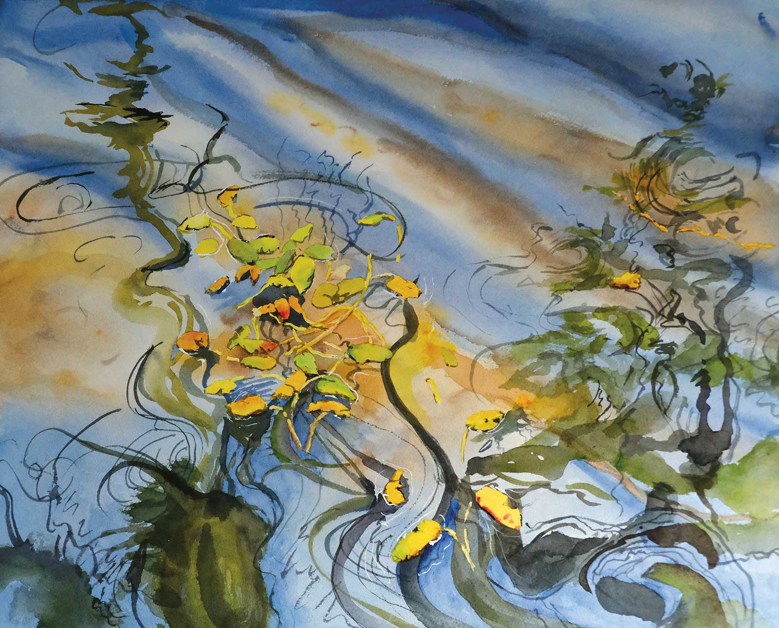 The immediate inspiration for Drifting was the Swale Pond Bird & Wildlife Sanctuary in Trenton, New York, near my home. I painted in my studio based on photos of fallen leaves upon swirling waters. The larger inspiration was a year painting water to prepare for a live multimedia event with pianist Tina Toglia and actor Peter Loftus. Called “Musical Canvas: Water,” the performance required an intense painting study to be able to paint in front of a live audience. Drifting is part of the resulting series, View from our Waters. I am also fascinated by Asian ink painting and was inspired by a class with artist Sungsook Hong Setton.
