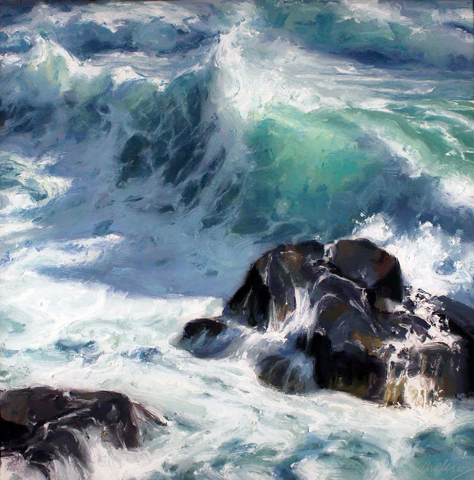 Seascapes became a passion of mine after I moved to the East Coast about five years ago. I have always been captivated by the natural world and have been painting flowers and plein air landscapes for decades. I use impasto brushwork to capture movement and subtle shifts in color, but I love how these techniques can be pushed even further in capturing the dynamic qualities of the sea—the variations in transparency and movement as water rises into a wave, is transformed into spray by the wind, and then breaks violently against the rocks.