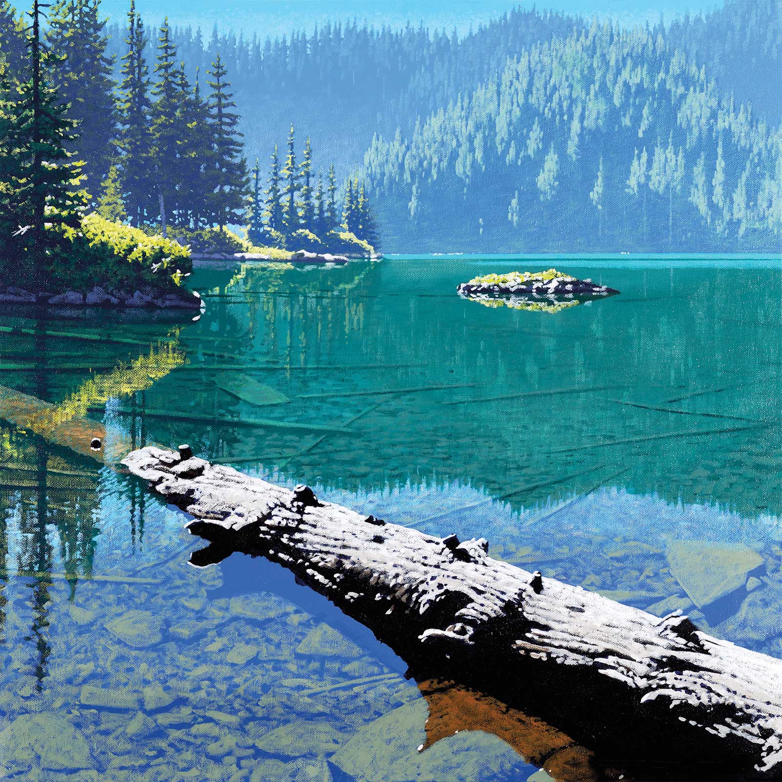 My passion for painting landscapes has spanned over five decades. My artistic motivation springs from the streams, rivers and clear waters that I grew up with. My choice to focus on these subjects allows viewers to share in my experiences. This painting is based on reference taken from a serene lake in the Pacific Northwest. I was captivated by the crystal clear, turquoise waters, and wanted to reproduce that feeling in the painting. The water reflects the surrounding landscape, including the dense pine trees and distant forest hills.