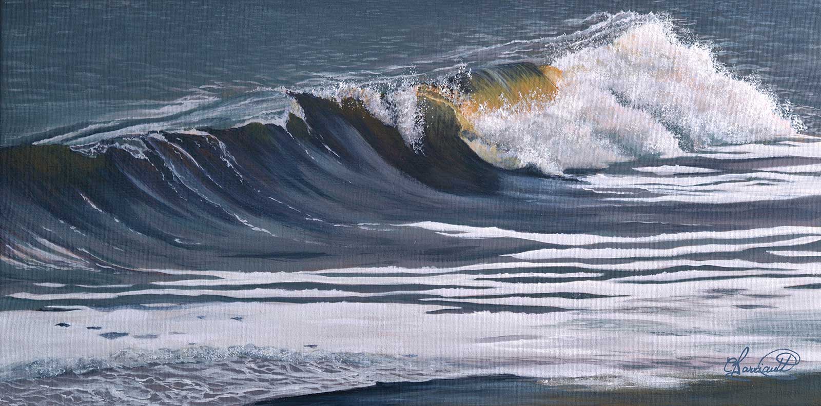 Using my own photographs, some observations made while standing by the sea, and my own sketches, I select the elements that will allow me to capture an instant of the wave’s movement that I want to paint. Above all, I want my artwork to evoke emotions, a reminder of happy moments spent by the sea. This painting is inspired by long hours spent on the beach of Sept-Îles in Québec. This St. Lawrence River’s wave is pushed by a southeast wind, giving it a different angle of view to paint. I want to express the movement of the water and the force it evokes.