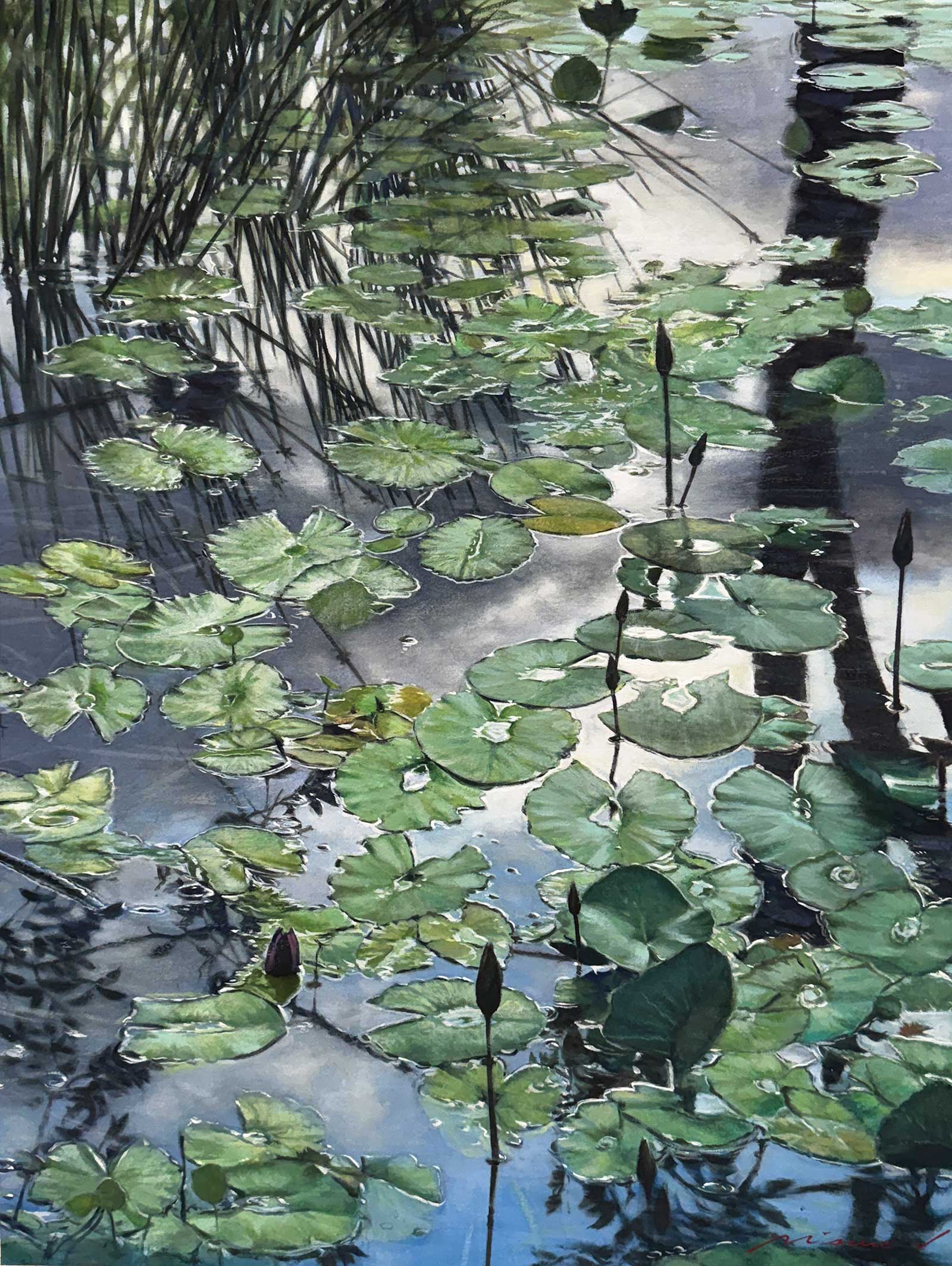 I begin by establishing the atmosphere, allowing the paper to breathe with the awakening lake. Gradually, I refine the details, harnessing the qualities of the medium so that each lotus leaf and bud becomes a symbol of life. Finally, layers of light and shadow guide the viewer into a meditative realm that surpasses the scene itself.