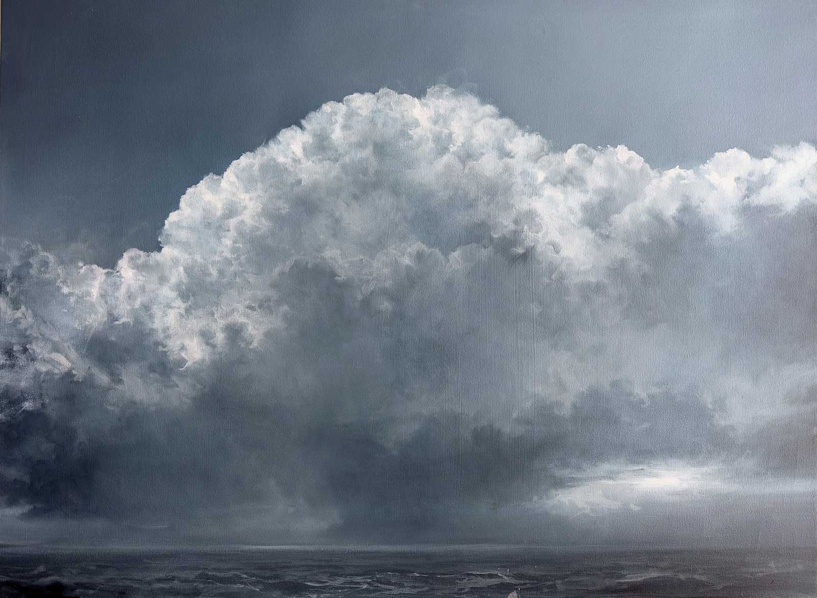 The composition is intentionally simplified: a low horizon positions the cloud to carry the emotional weight and the sea and storm to connect to it as a way to speak to the cyclical nature of water (life).