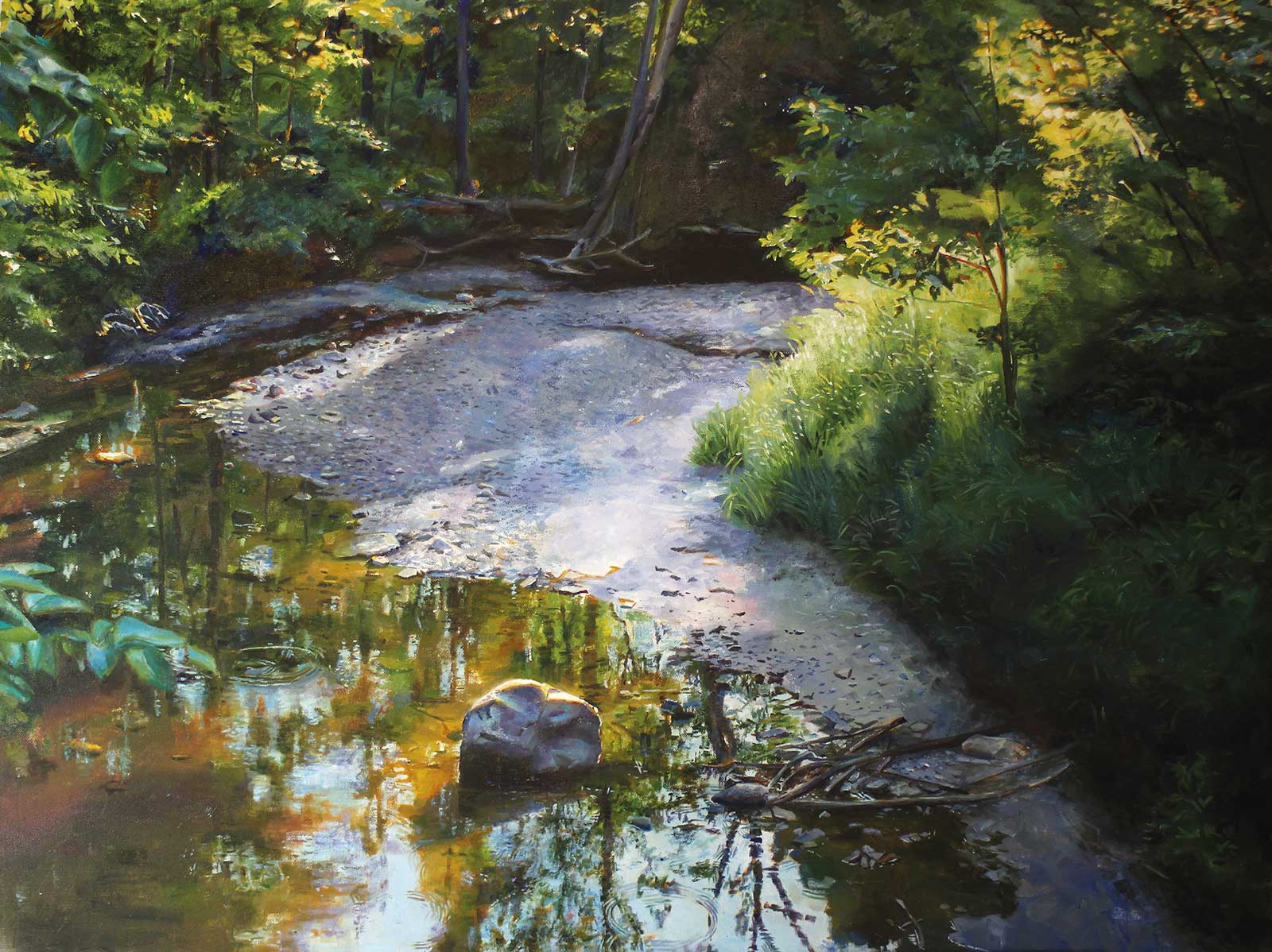 Whether painting the awe-inspiring vistas of Glacier, the wildlife of Yellowstone, the iconic mountains of the Tetons or the grandeur of Rocky Mountain National Park, my subject is light. I look for the glowing translucency of foliage, the illumination of clear water and reflection of ripples and the atmosphere of light dissipated through the mist. I looked for those same elements in the subject of this painting, which comes from closer to home. It is of a park in my hometown, a preserved pocket of wild among the “development.”